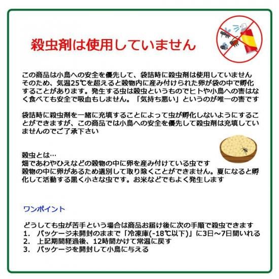 メガバクテリア症(AGY症)、慢性胃炎の食事療法としてお使い頂けます。 消化吸収に配慮した原料を選定 免疫機能を維持する、マルチビタミン配合 毛づやの健康維持する、良質なタンパク質を含む原料を配合 通常用としては「厳選ブレンド(シードミックス)」がオススメ 小食で体重が増えにくい、繁殖期で栄養をつけたいときは「厳選シードミックスB 体重増加」がオススメ 消化不良による体重減少時は「厳選シードミックスA 消化ケア」がオススメ 【内容量】 600g(チャック付き袋) 【対象】 消化吸収に配慮が必要な、セキセイインコ、サザナミインコ、マメルリハ、オカメインコ、ウロコインコ、アキクサインコ、ボタンインコ、コザクラインコなどの小型〜中型インコ・オウム 分類コード 1101 1102 1103 1104 1105 11061107
