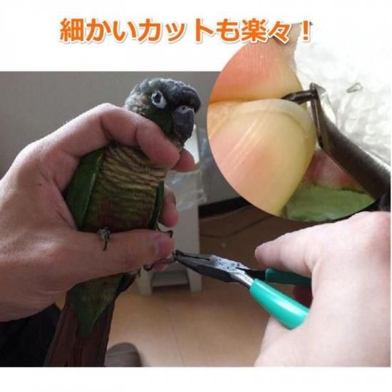 小鳥専門動物病院でも使用中で、全国の動物病院・動物園からも多数のご注文を頂いている、プロも認める使いやすさ! ------------- 対応可能な鳥類 キンカチョウ、十姉妹、文鳥、セキセイインコ、マメルリハ オカメインコ、ボタンインコ、コザクラインコ、サザナミインコ、ウロコインコ アキクサインコ、ヒインコ、ヨウム・・・など ------------- ※本製品はホビー用として販売している商品をとりっぴー独自アレンジを加えています。 ●他店で通常販売されているホビー用は工業用油が塗布されており、この油が鳥の羽根や皮膚、目に入ると炎症を起こす可能性があり非常に危険です。 とりっぴーで販売している本商品は工業用油を完全除去、鳥に対して安全な油に置き換えています ●使用後のメンテナンスに必要となる安全な油をボトル容器に入れてサービス中 ●鳥専門動物病院と共同で作成したオリジナルつめ切りマニュアル付き 安心の日本製 全長12cm 刃のサイズ 5mm 1101 1102 1103 1104 1105 1106 1107